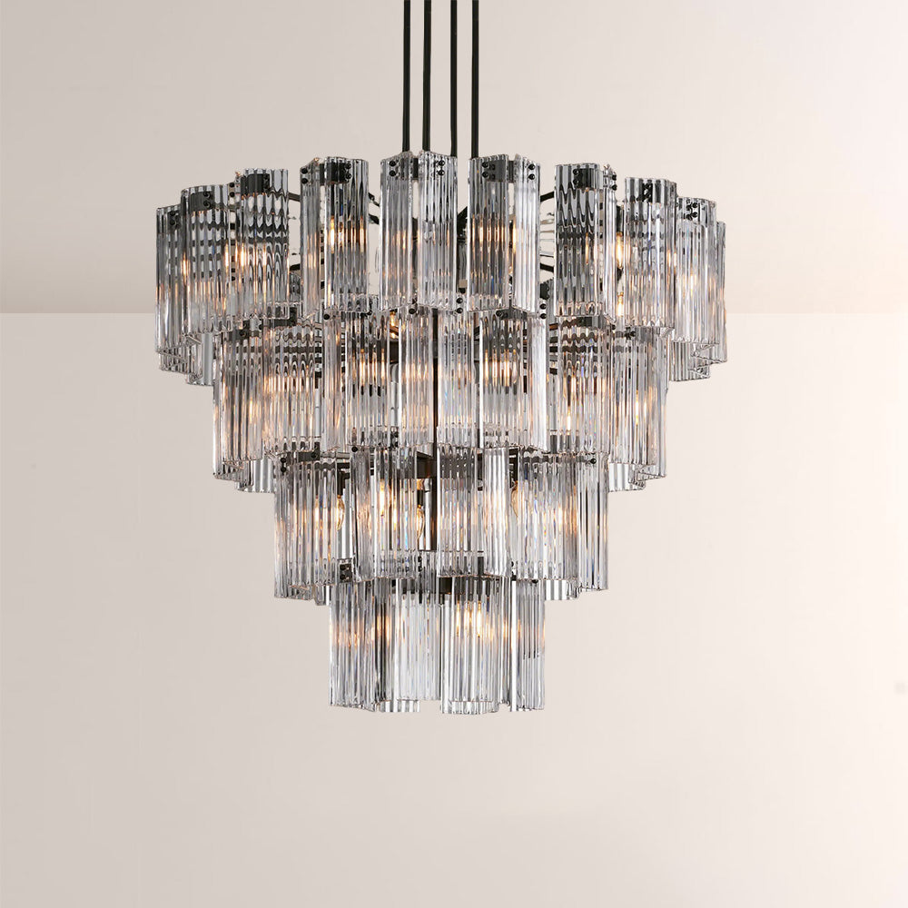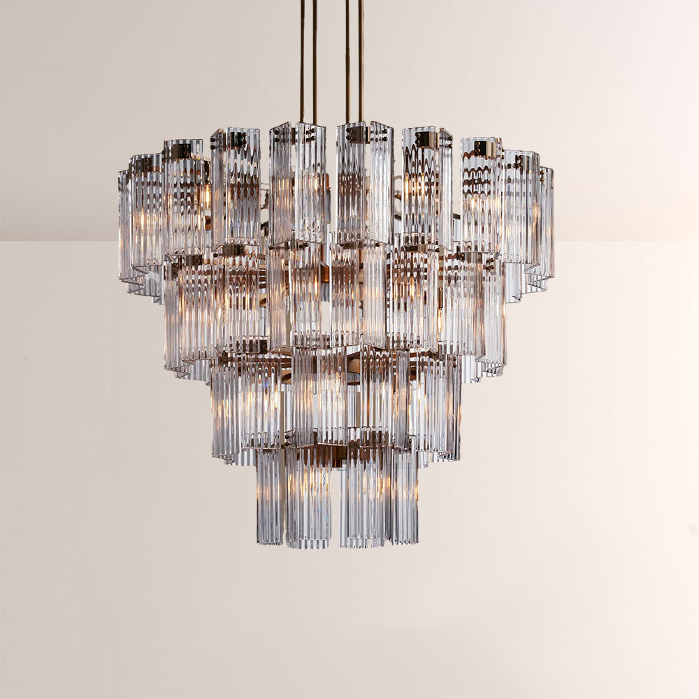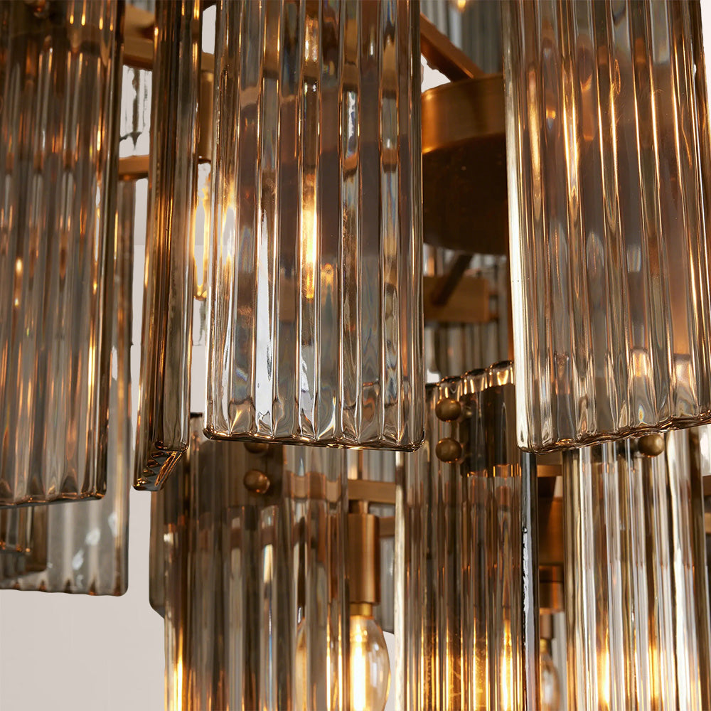 The Delsia Collection brings old Hollywood glamour into the modern era with a refined interpretation of classic silhouettes. Beveled glass panels are elegantly arranged around a steel frame, casting warm, radiant light and creating a dramatic yet timeless presence in any space.