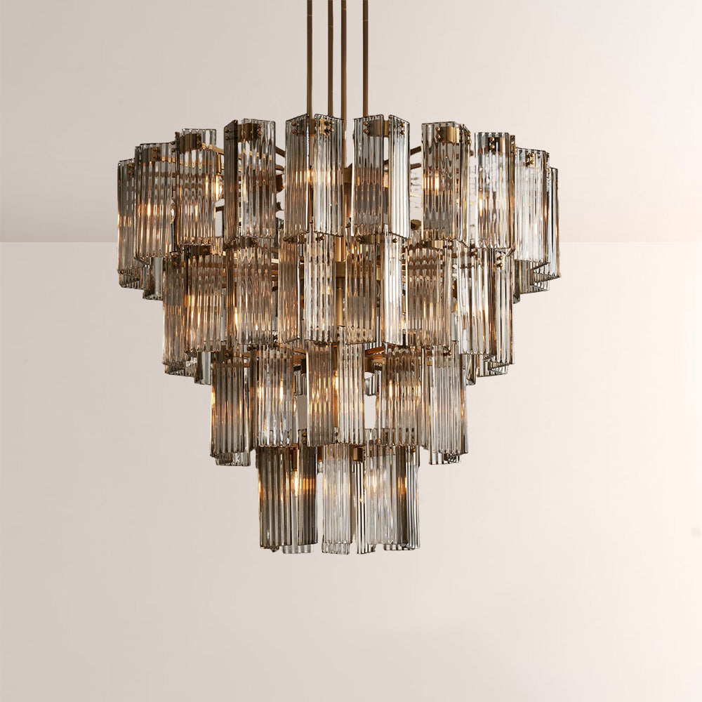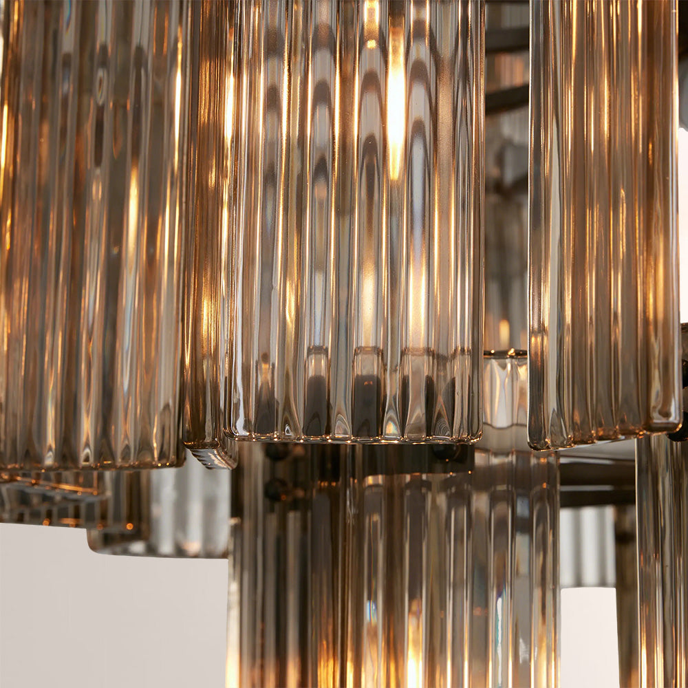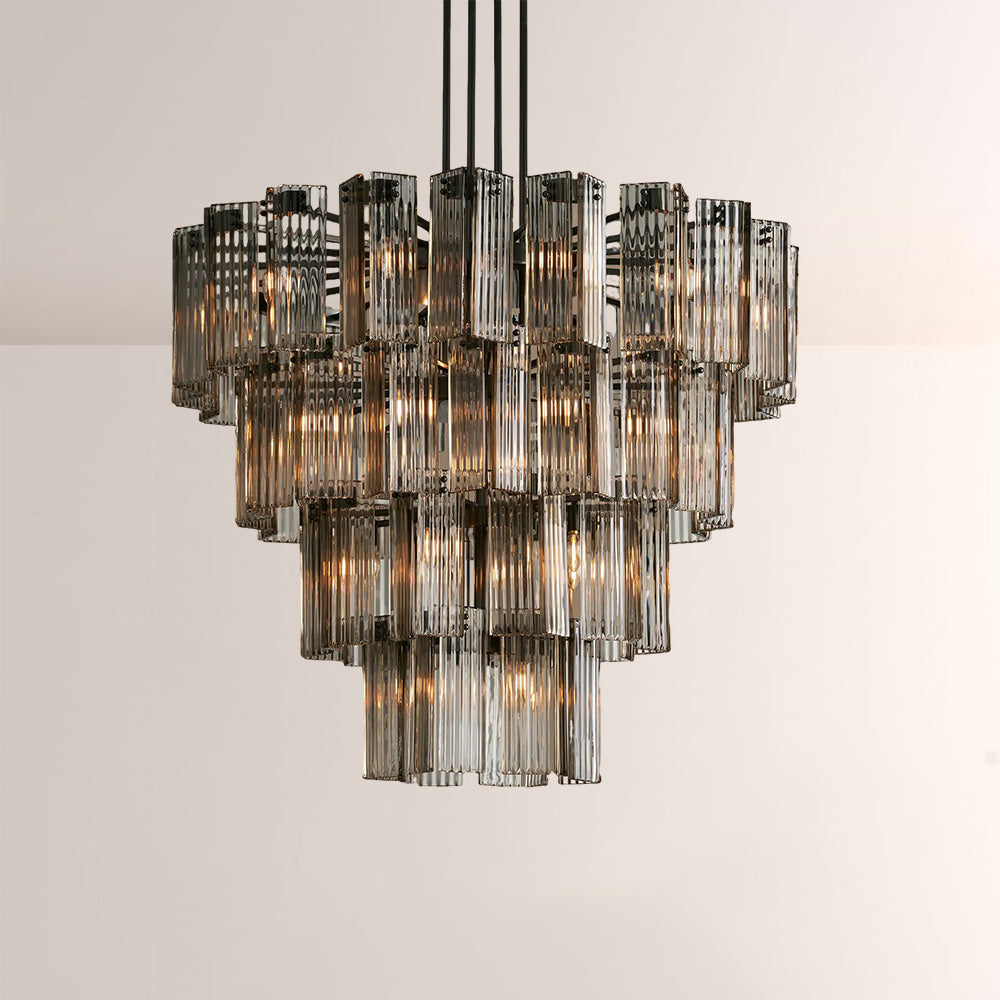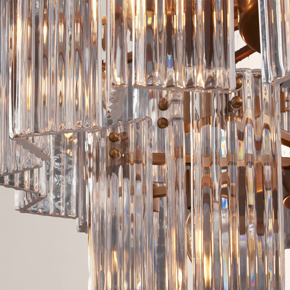 The Delsia Collection brings old Hollywood glamour into the modern era with a refined interpretation of classic silhouettes. Beveled glass panels are elegantly arranged around a steel frame, casting warm, radiant light and creating a dramatic yet timeless presence in any space.