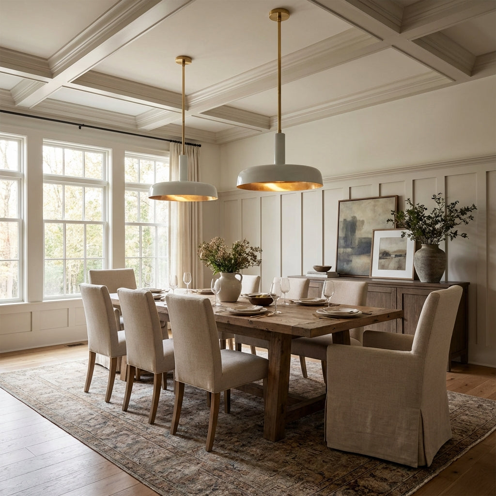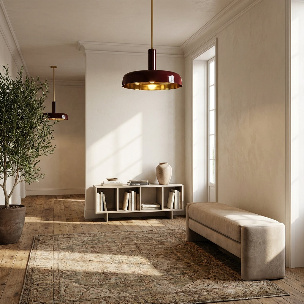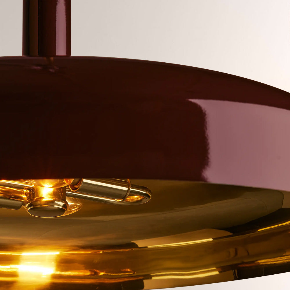 Infuse your space with bold modern elegance using the Brennan Pendant. Crafted with a high-shine mahogany lacquer dome and a luxe brass interior, it merges sleek contemporary design with warm metallic accents. The streamlined profile and polished brass canopy complement both compact kitchen nooks and spacious dining areas. Offered in 10" and 24" sizes, it casts a refined glow for everyday use and entertaining alike.