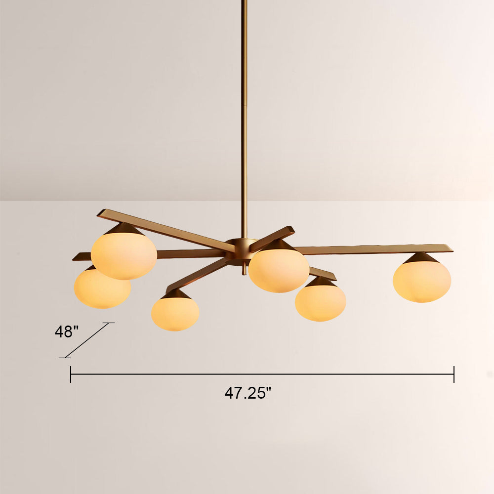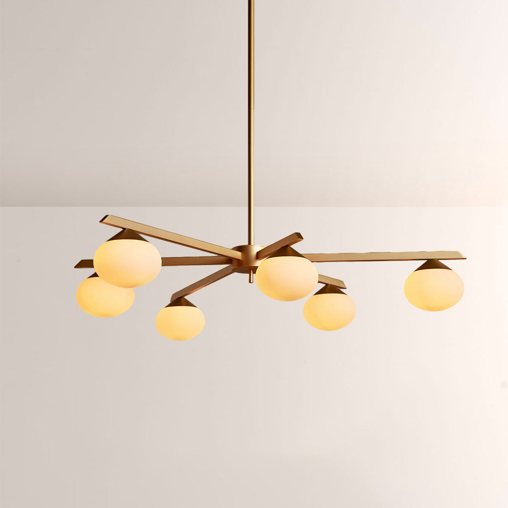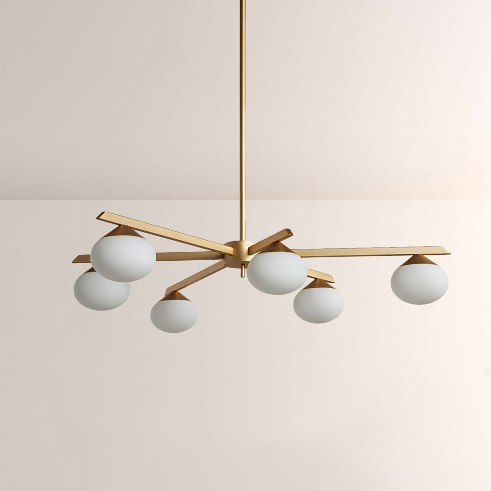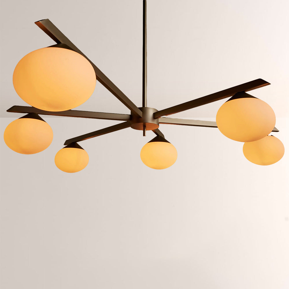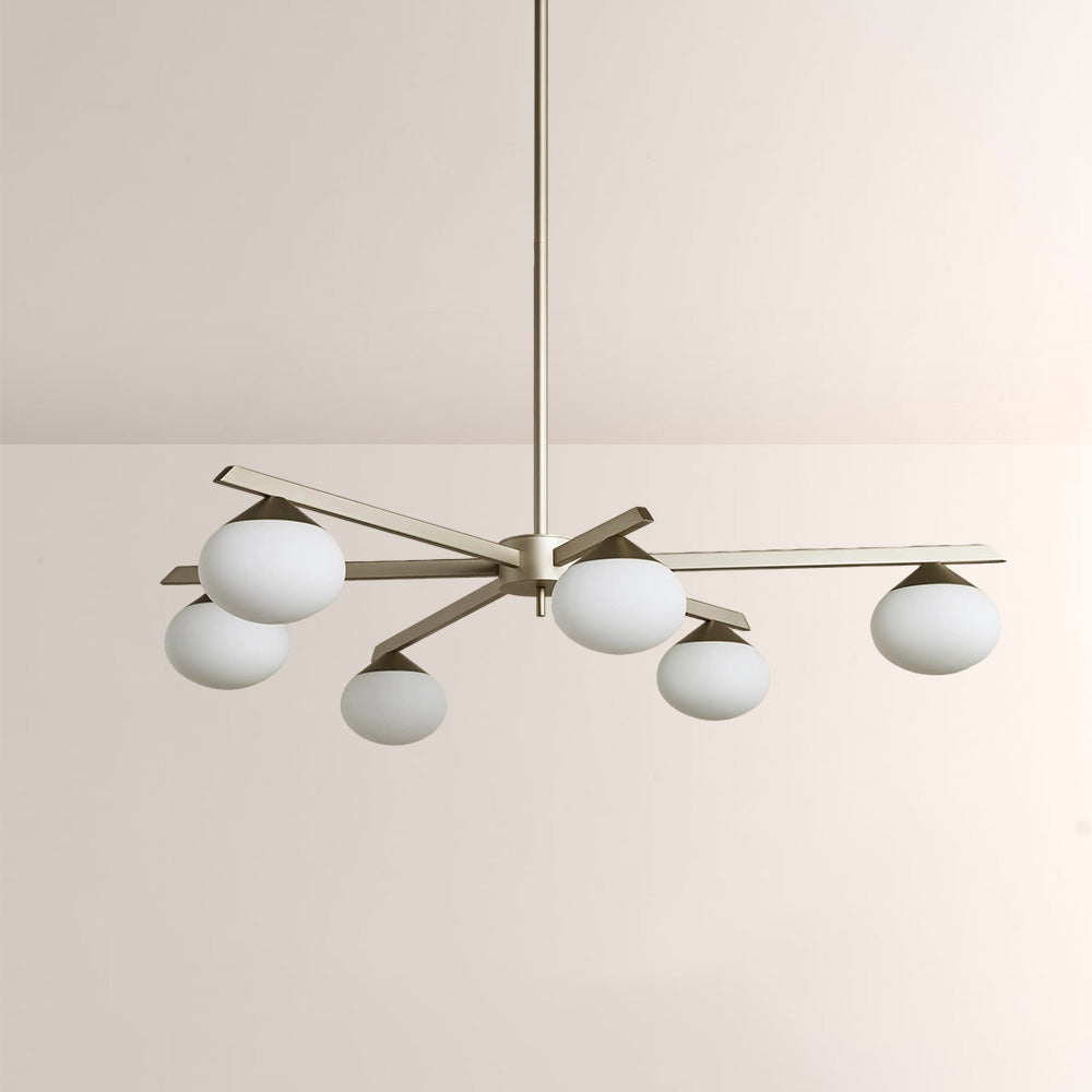 The Cosmo Staggered Arm Chandelier reimagines mid-century modern design with its architectural, angular frame and soft opal glass diffusers. Crafted for refined spaces, its elongated, offset arms create dynamic visual balance, casting a warm, even glow that elevates contemporary dining rooms and open.