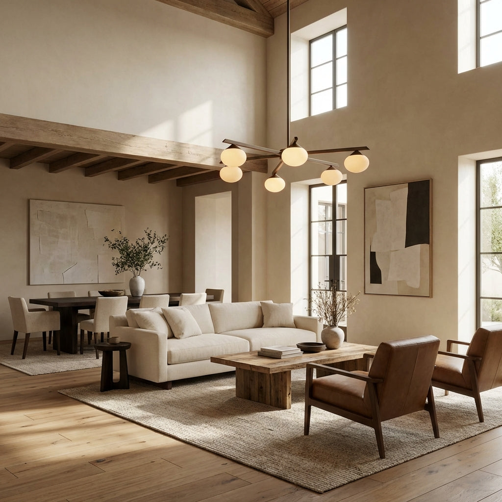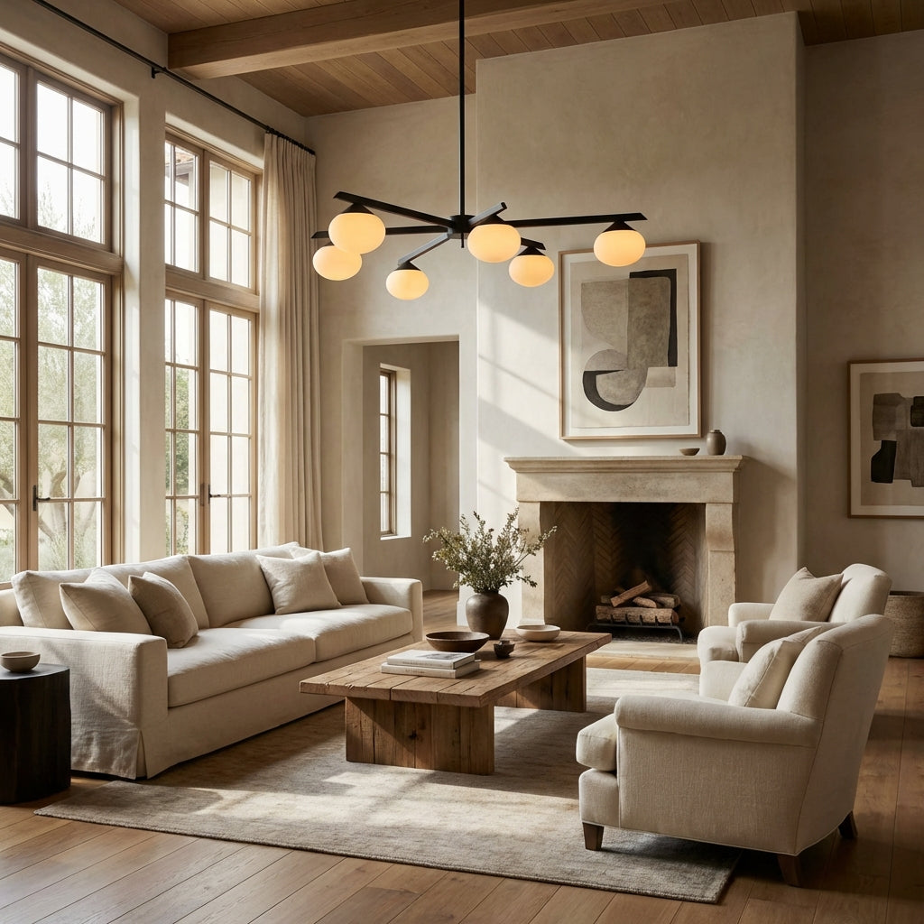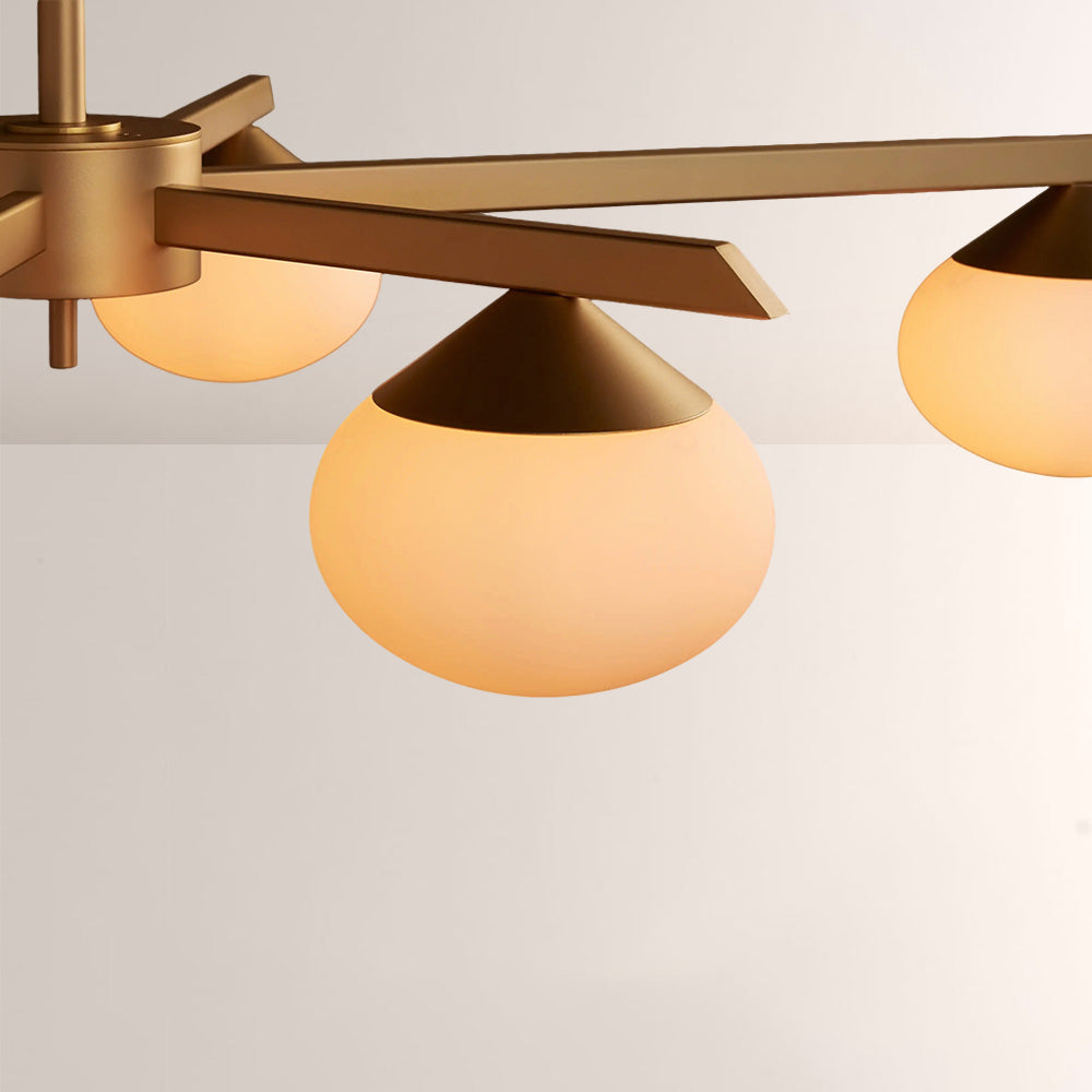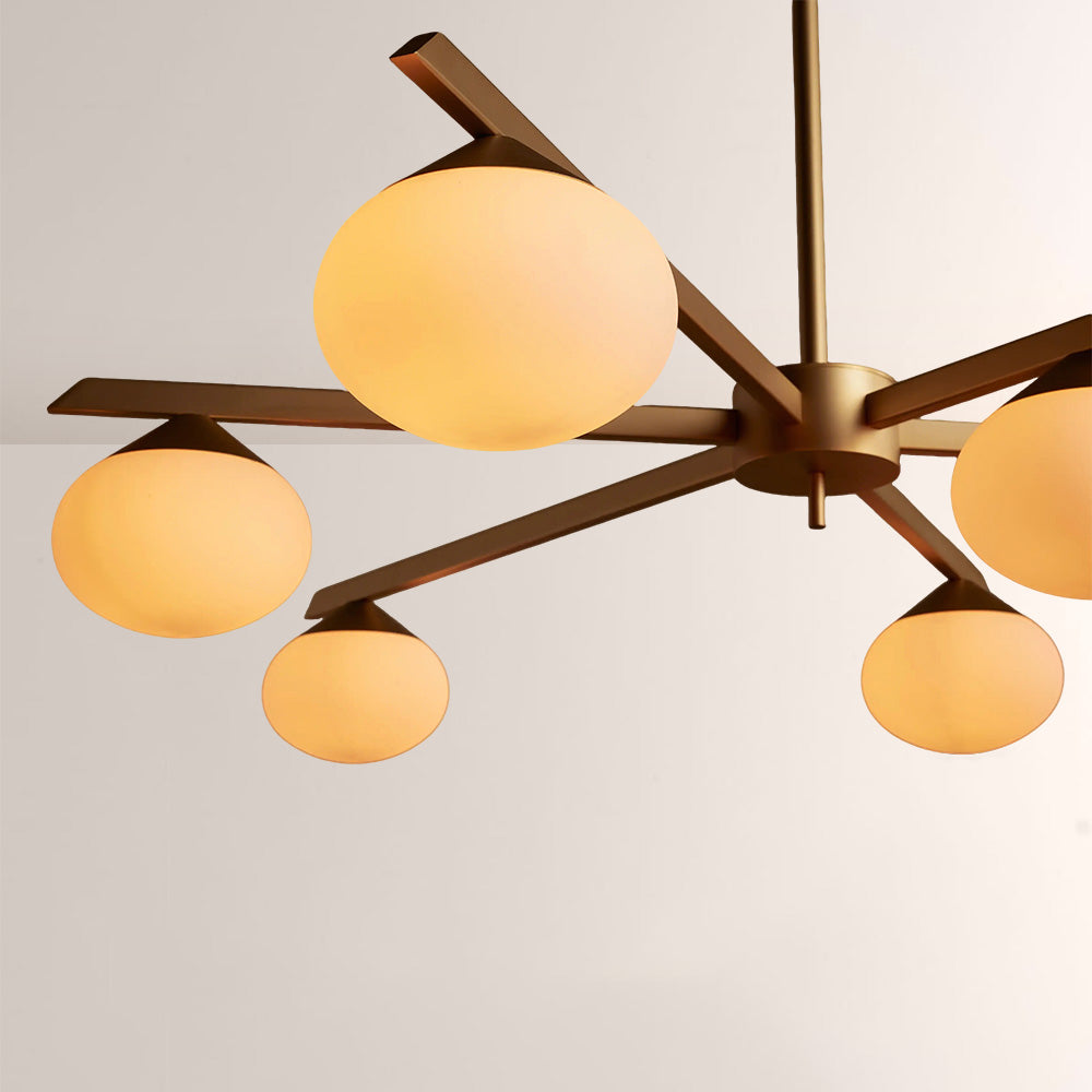 The Cosmo Staggered Arm Chandelier reimagines mid-century modern design with its architectural, angular frame and soft opal glass diffusers. Crafted for refined spaces, its elongated, offset arms create dynamic visual balance, casting a warm, even glow that elevates contemporary dining rooms and open.