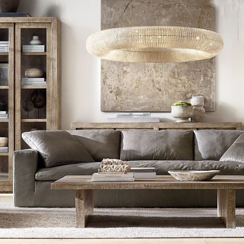 | The collection of chandeliers/wall sconce, inspired by French antique designs, features thousands of faceted, hand-wrapped smoked glass beads encasing a steel frame, forming a floating sphere suspended by steel cables. The beads filter and refract light, casting a soft, inviting glow. |