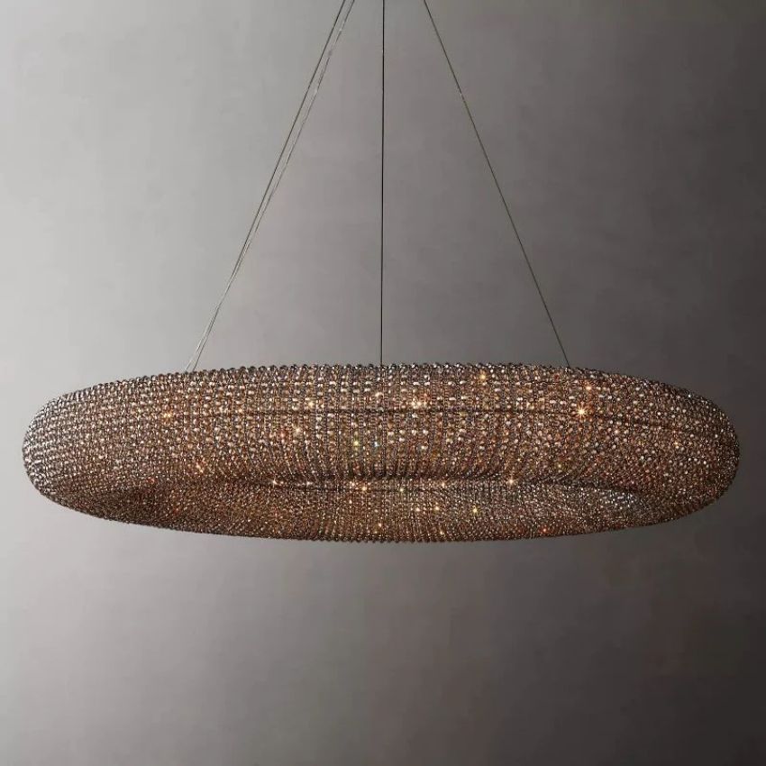 | The collection of chandeliers/wall sconce, inspired by French antique designs, features thousands of faceted, hand-wrapped smoked glass beads encasing a steel frame, forming a floating sphere suspended by steel cables. The beads filter and refract light, casting a soft, inviting glow. |