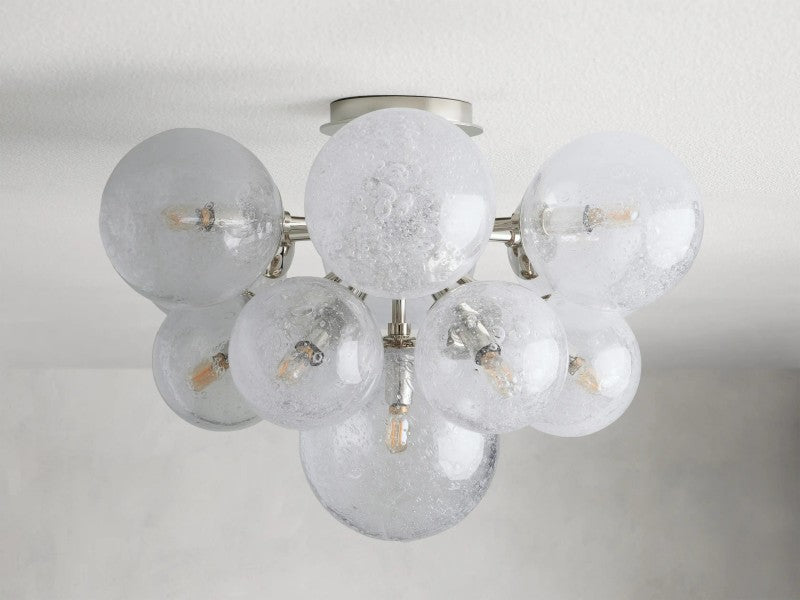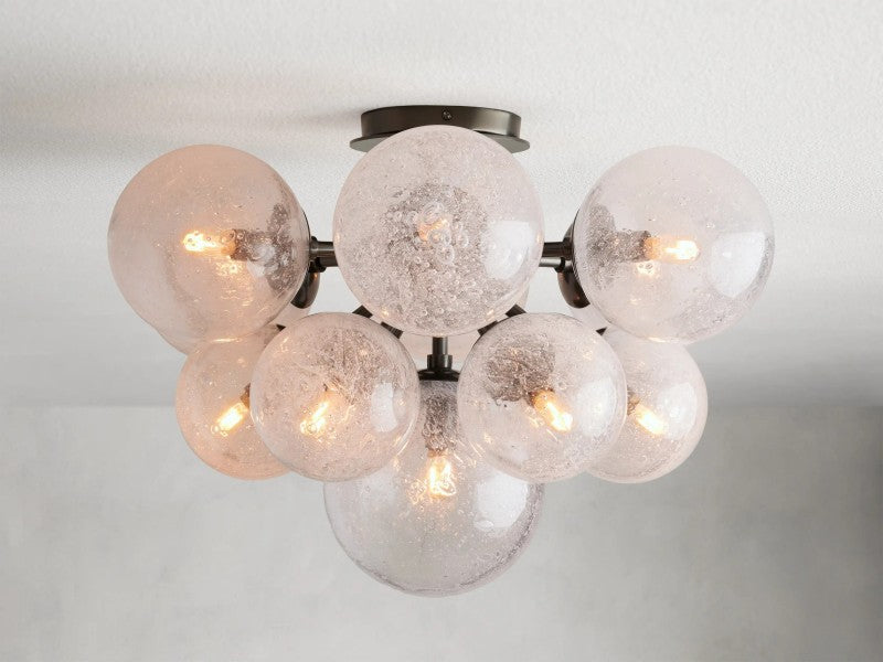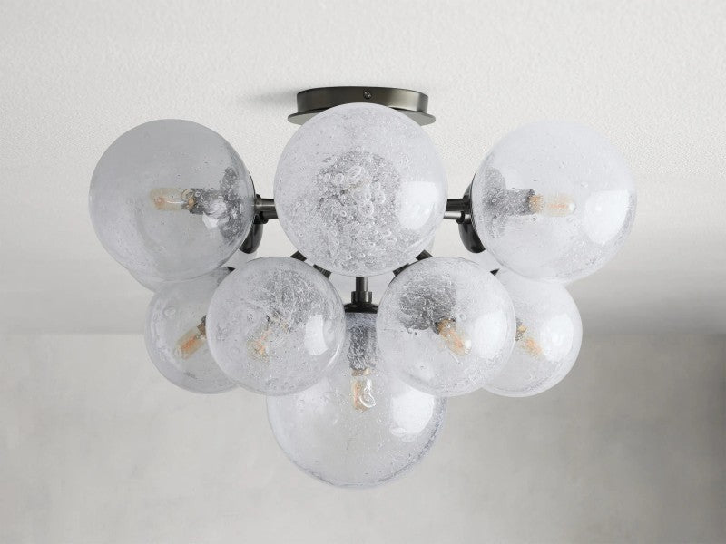 A fusion of rustic charm and industrial design, our Mandoza Collection features stunning silhouettes and mixed-material style. Each individual glass globe is hand-blown with a reactive technique, creating a dense network of bubbles under a thick layer of glass. The result has a striking effect when illuminated from within, casting light from every angle.