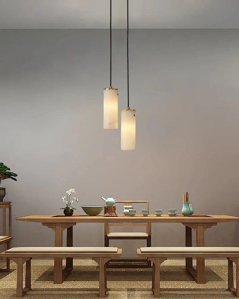 Illuminate your home with Nular Alabaster Pendant Light! This sophisticated and unique light features a slender stone tube that is lit from within, showcasing its mesmerizing natural hues. Create a calming atmosphere with soft, warm light, and admire the beautiful contrast between the white and veins!