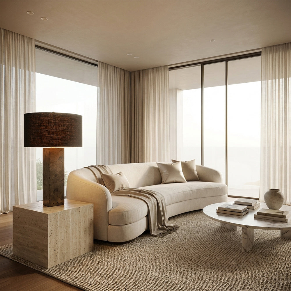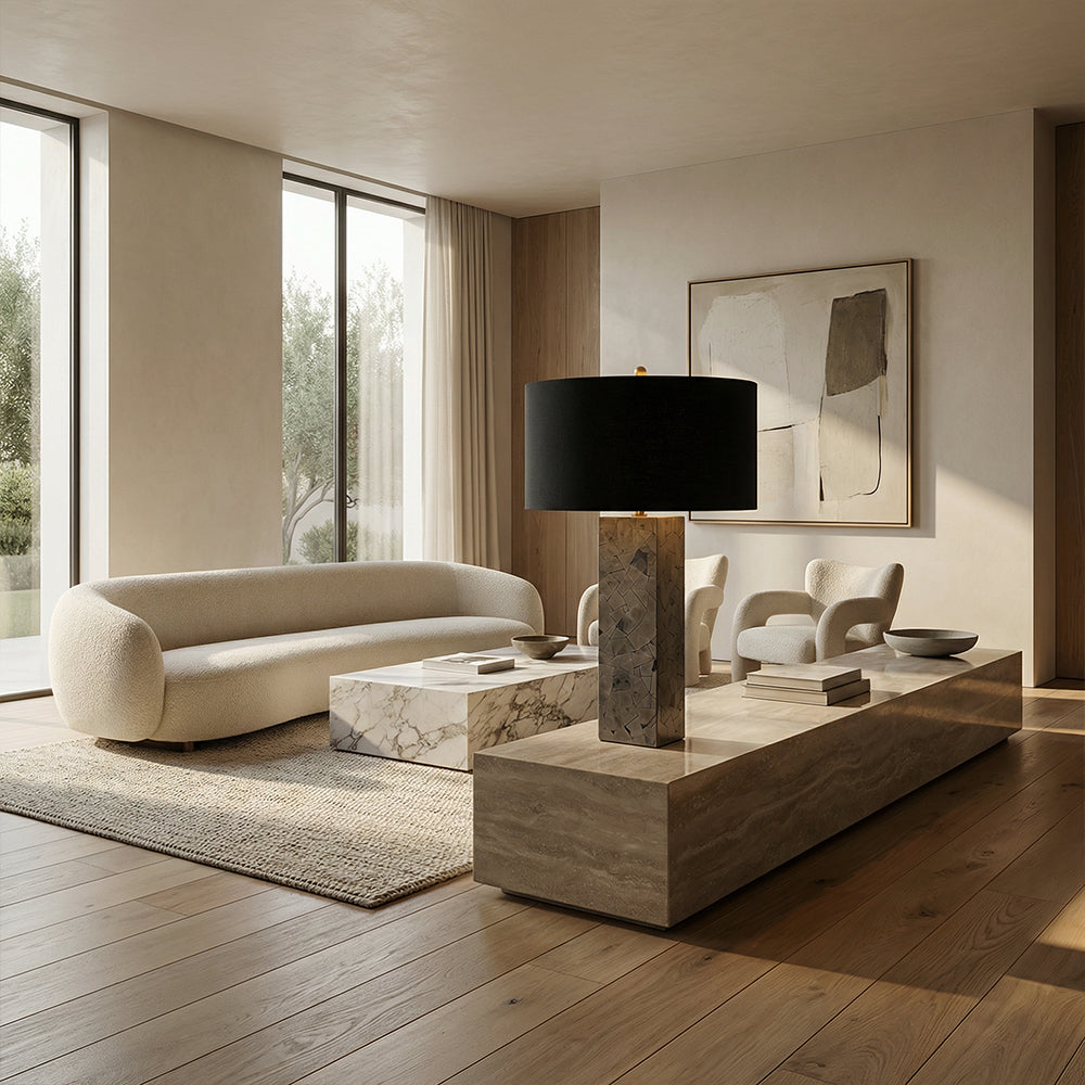 The Pyrite Mosaic Table Lamp is a bold expression of modern luxury, crafted for discerning American interiors. Its tall, square body is constructed from fragmented natural stone mosaic, creating a rugged, organic texture that catches light beautifully.