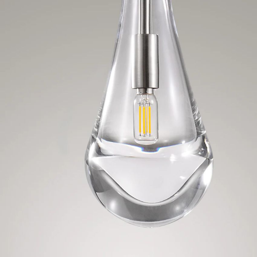 Much like the rhythm of a rainstorm itself. Suspended from slim black cords, drops of blown glass encase the bulbs – creating the illusion of underwater illumination – and cast luminous ripples that wash across ceilings and walls.