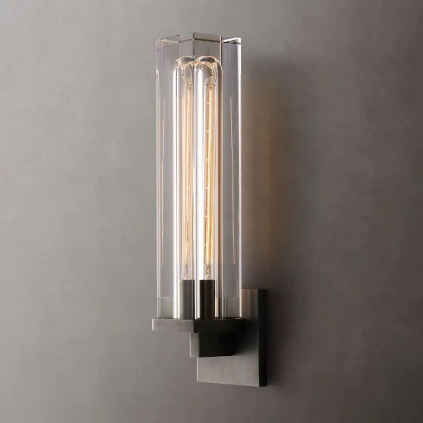 Our Savill collection is a captivating exploration of solid and void. A monumental crystal block, meticulously carved with a concave channel, embraces an Edison bulb within a solid brass frame. When lit, the crystal reveals its inherent solidity, beautifully refracting and reflecting the bulb's light. In darkness, it transforms into a weightless transparency, adding an ethereal touch to its allure.