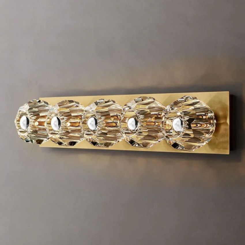 The collection crafted of solid brass and crystal glass,  for luxe materials and superior craftsmanship, each finely faceted sphere is ground and polished by hand to reflect and refract the light.