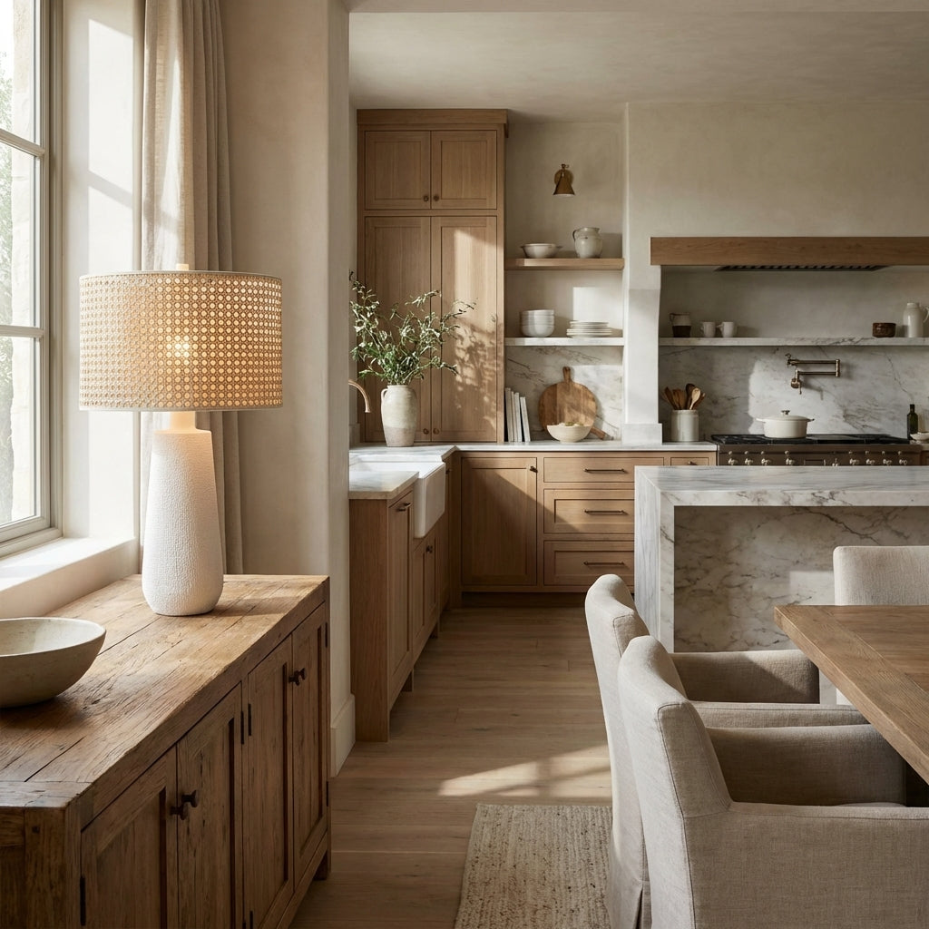 The Sturia Textured Table Lamp is a sculptural embodiment of modern organic luxury, crafted for discerning American interiors. Its tapered body is finished in a hand-textured stucco-style coating that evokes rustic warmth, paired with a natural rattan drum shade that filters light into a gentle, ambient glow.