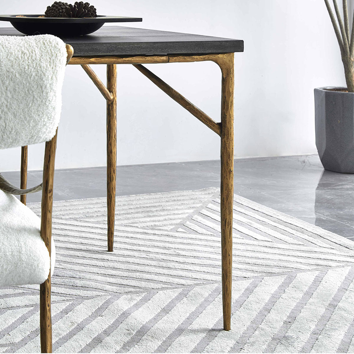 This rectangular dining table uses contrasting materials to create a unique industrial modern design. The solid wood countertop is supported by a slender vintage copper and iron frame for a transparent appearance.