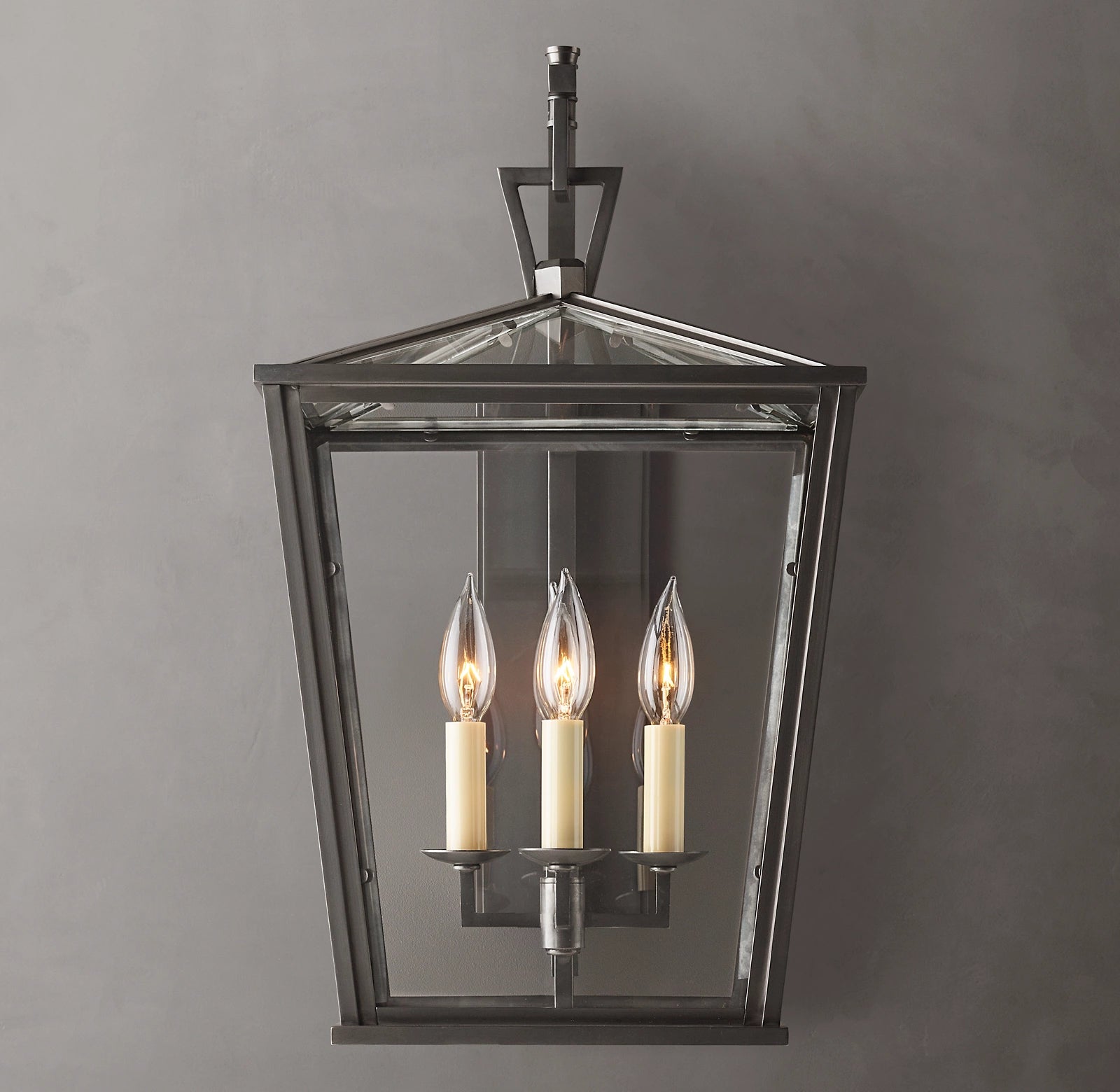 The forthright design of our lantern-style fixture reflects the functional architecture of 19th-century lighting. Spare and elegant, it showcases candlestick-style lamps held aloft within an airy frame. |