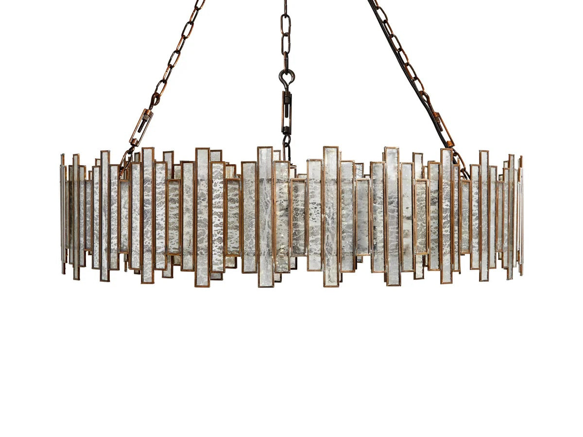 Lustrous, hand-antiqued mirrored-glass panes of various sizes make up the unique shape of our Moroccan-inspired Zaira Lighting Collection. Finished in Antique Copper with just the right amount of shine, this chandelier will add soft, warm light to any room.